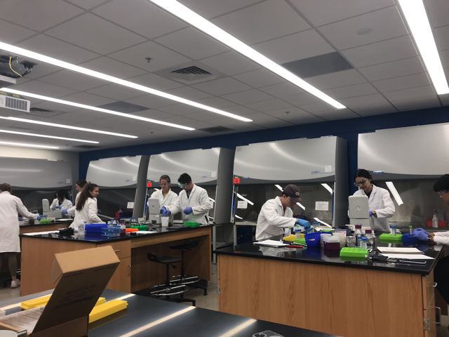 Undergraduate students performing bacterial isolation experiments in recently renovated laboratory space in the Boggs building.