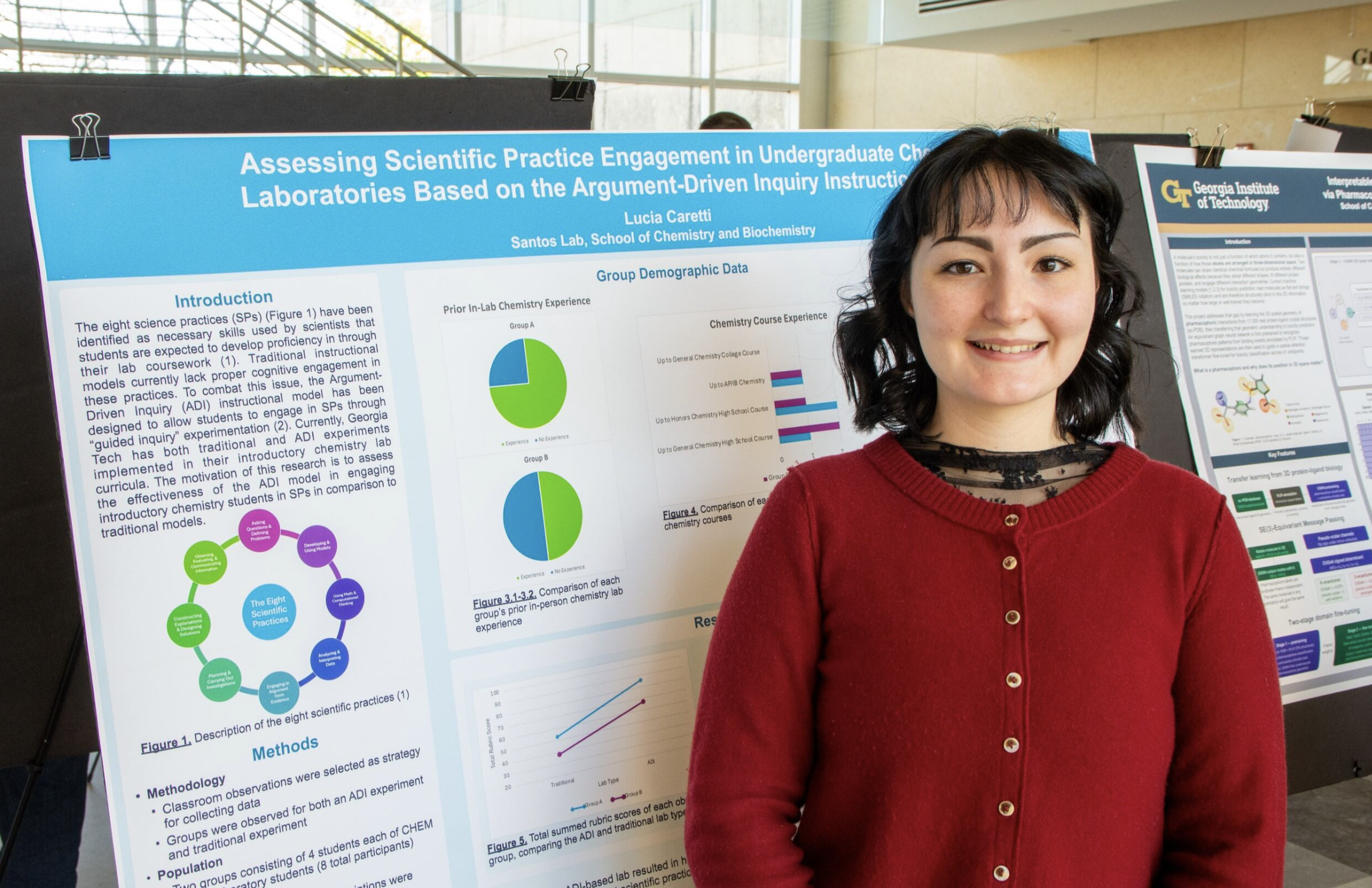 On March 17th, the School of Chemistry and Biochemistry ran a research showcase event, so that its undergraduates could learn more about the many projects being conducted in the school and make connections to help them engage in research. Graduate and undergraduate research students presented posters on their work. The posters covered a broad cross section of the school's research and included fundamental studies of immune response, the effectiveness of undergraduate laboratory instruction, protein folding in lipid environments, protein structure and function, machine learning studies of protein drug interactions, evolutionary studies of proteins, studies of optical and electronic materials, high level quantum mechanical studies of molecules and materials, and the use of mass spectrometry to study a range of biological problems.